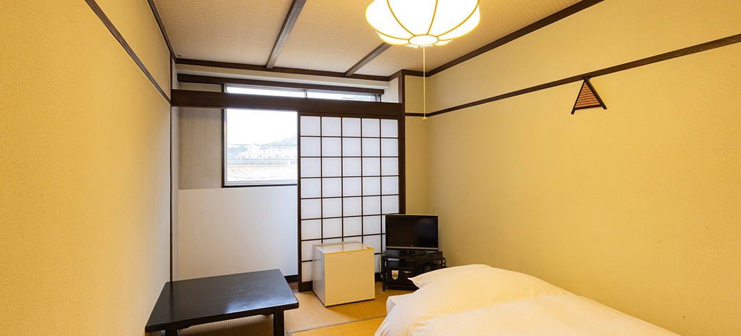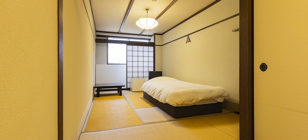 和室6畳のお部屋にシングルベッドを配置したお部屋。お一人で過ごすにはちょうど良い落ち着く広さです。