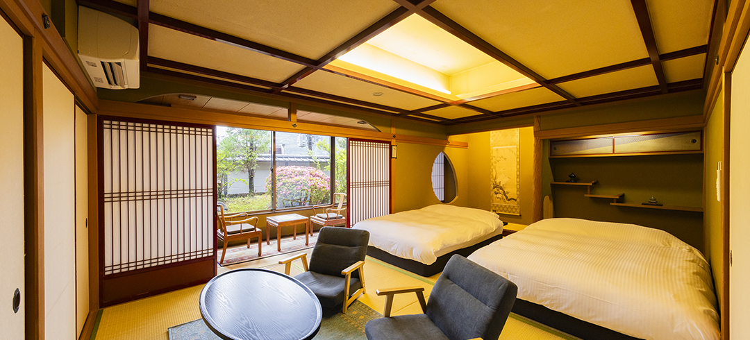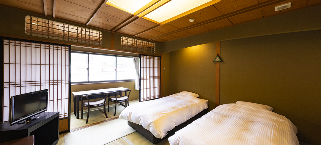 10畳の和室にツインベッドをご用意したお部屋です。カップルやお友達、ご家族とのご利用におすすめのお部屋です。