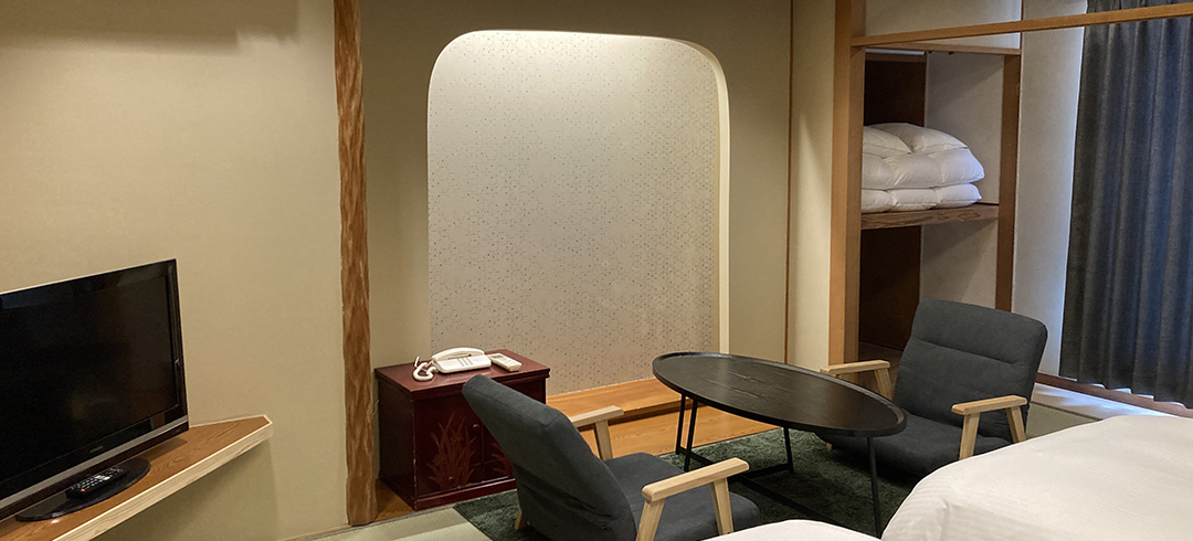 和室6畳のお部屋にダブルベッドを配置したお部屋。お二人で過ごすにはちょうど良い落ち着く広さです。