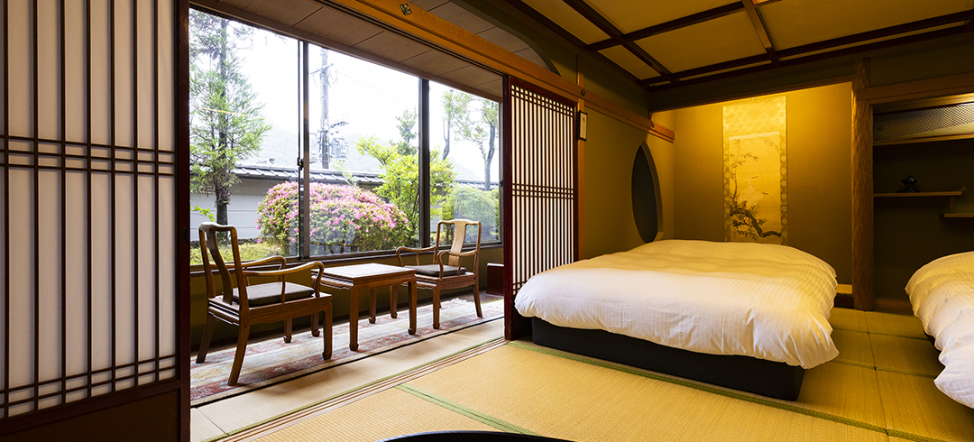2021年1月リニューアル。10畳8畳の二間続きの広々とした客室にアンティークな家具とベッドを配し、ゆったりとおくつろぎいただけるようになりました。